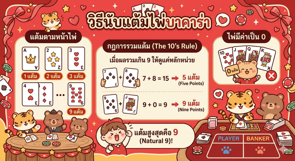 การนับแต้มในบาคาร่าเป็นเรื่องที่สำคัญ เพราะเป็นตัวกำหนดผลแพ้ชนะของเกม โดยกติกาการนับคะแนนมีดังนี้